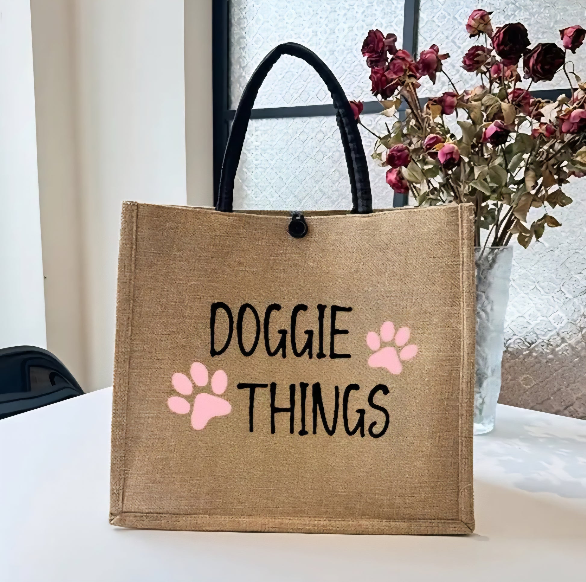 Diese charmante Tragetasche aus strapazierfähigem Naturleinen ist das perfekte Accessoire für alle Hundemütter, Tierliebhaber und Tierschützer. Mit der liebevollen Aufschrift „DOGGIE Things“ und süßen Pfotenabdrücken setzt sie ein klares Statement: Hier dreht sich alles um den besten Freund des Menschen.